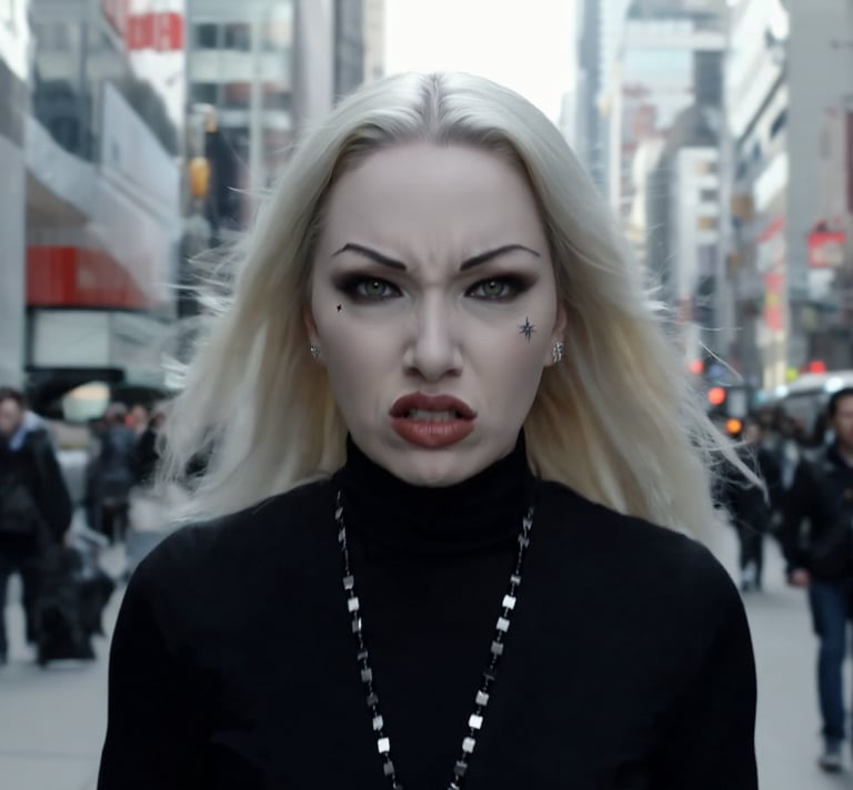 Sharp features framed by bioluminescent hair strands, one eye human, the other a shifting holographic lens. Beneath her coat of fractured leather and reactive alloys, faint circuitry glows with the pulse of her second heart.